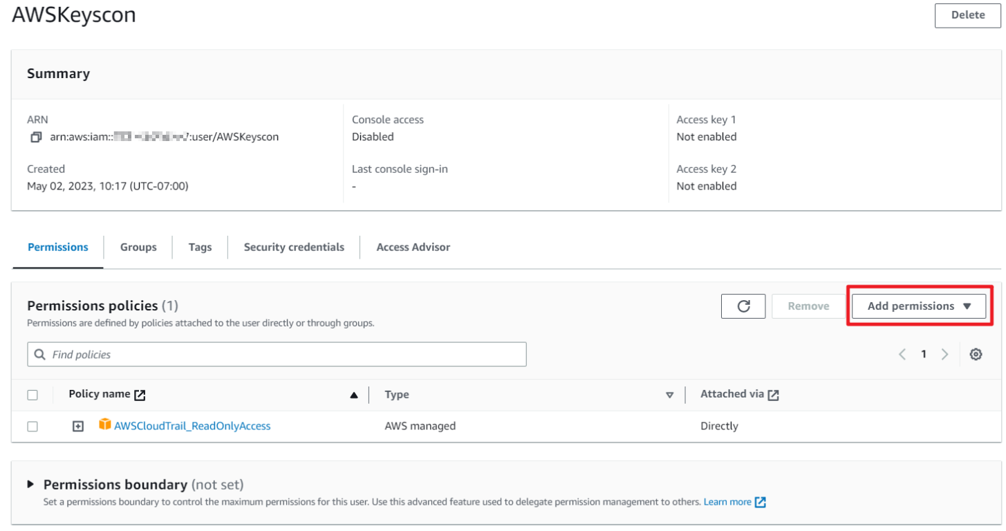 - Go to IAM > Users and select the AWS Connector user such as AWSKeyscon, and then click Add Permissions.