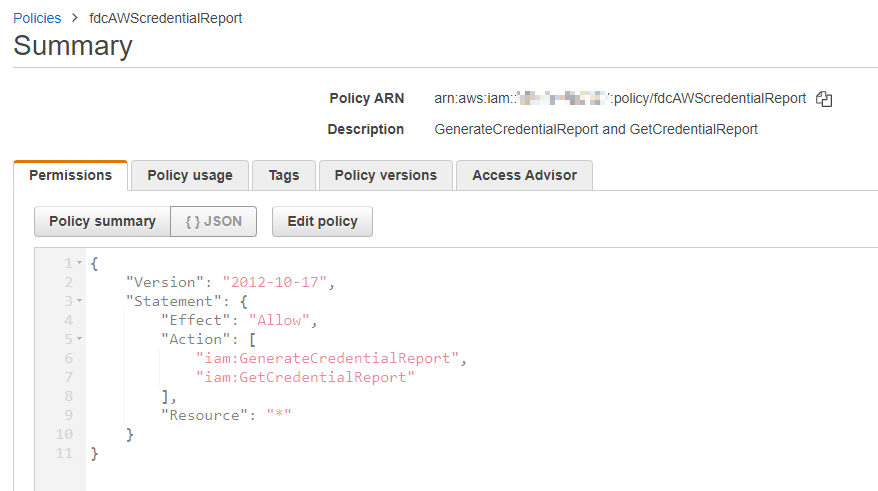 - Go to Policies and create a custom policy such as fdcAWScredentialReport.