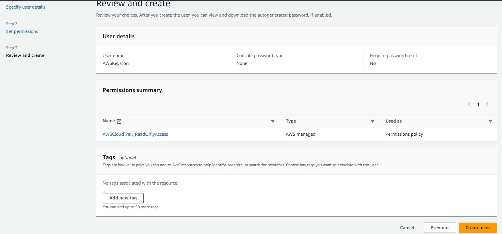 - Review the user permissions and click Create user.
