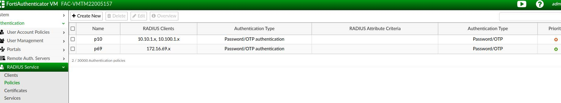 - Go to Authentication > RADIUS Service > Policies, and click Create New.
