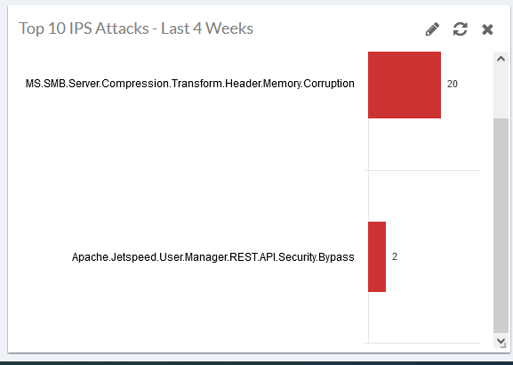 The Top 10 IPS Attacks widget displays the IPS attack name and number of events for the selected time period (24 hours, 7 Days, or 4 weeks).