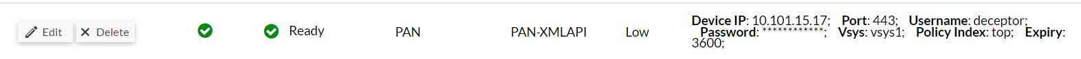 In FortiDeceptor, click Quarantine Integration and verify the PAN device status is Ready.