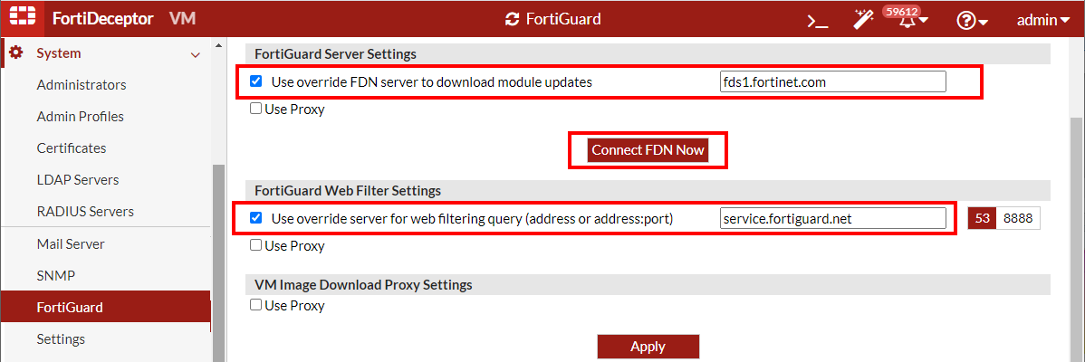 - In the FortiGuard Server Settings section, click Connect FDN Now to test the FDN connection.