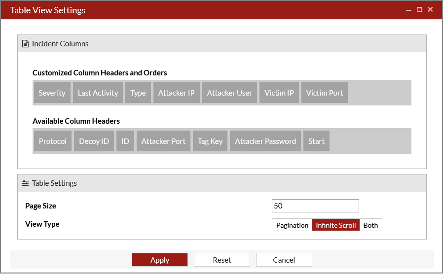 Page Size Enter the number of incidents to display per page when View Type > Pagination is selected. View Type Select Pagination, Infinite Scroll or Both.