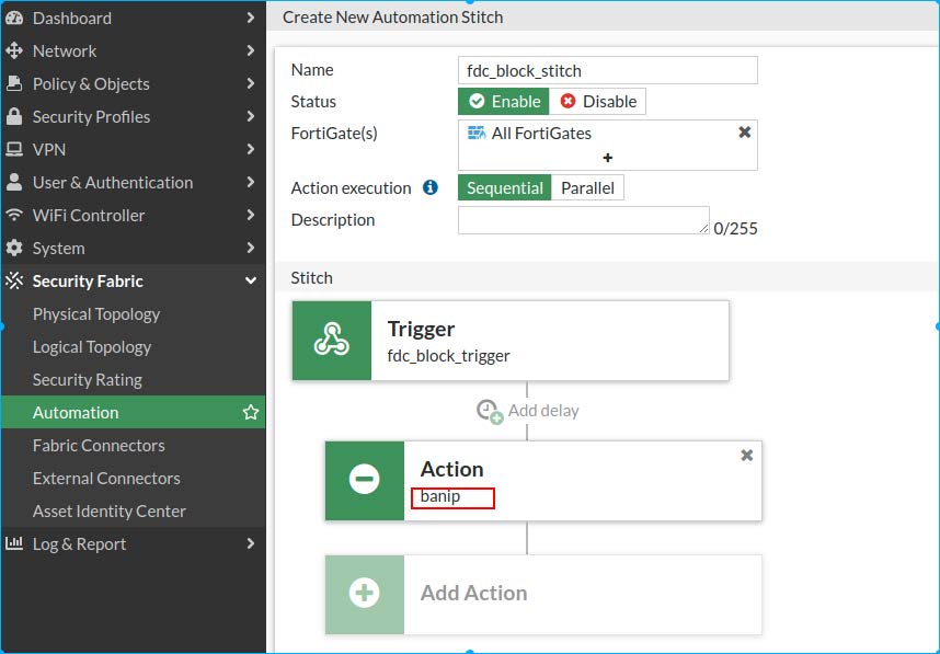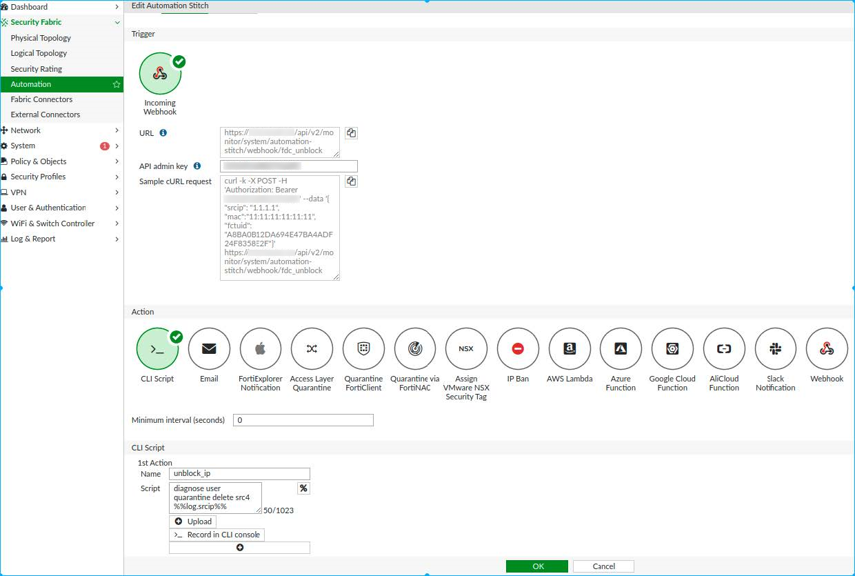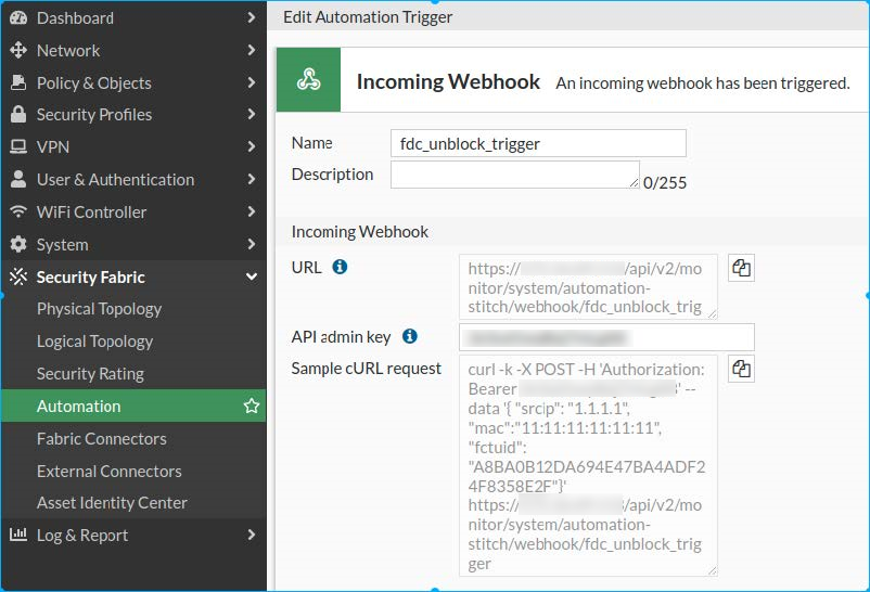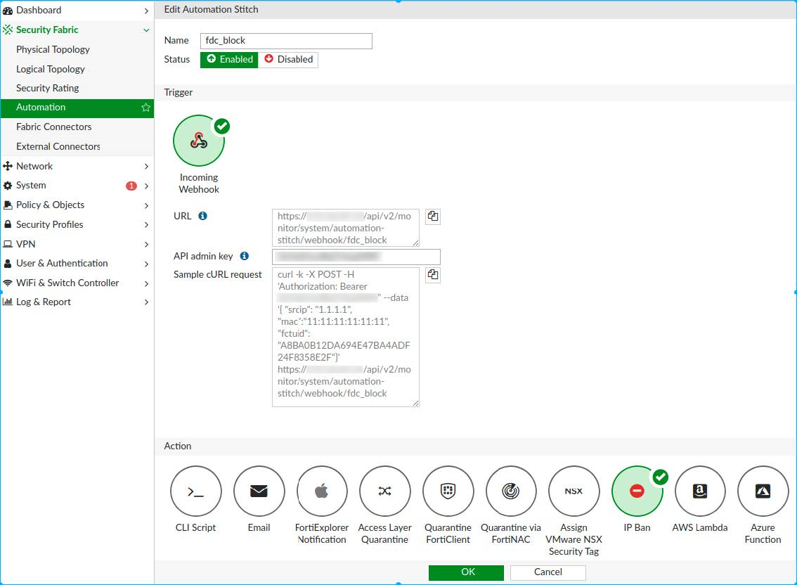 In FortiGate, go to Security Fabric > Automation and verify the Status for the block and unblock webhooks are Enabled.