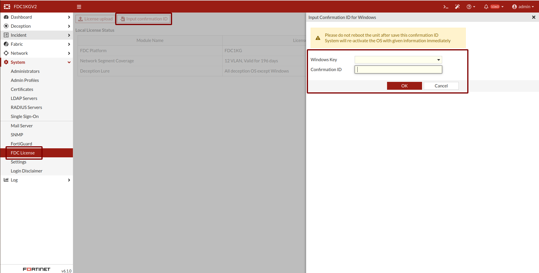 - FortiDeceptor will process the activation with the provided confirmation ID. Wait a few minutes and check the result. Do not reboot FortiDeceptor.