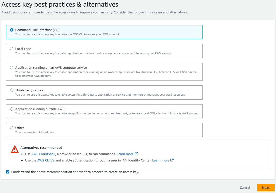 - Under Access key best practices & alternatives select Command Line Interface (CLI) and click Next.