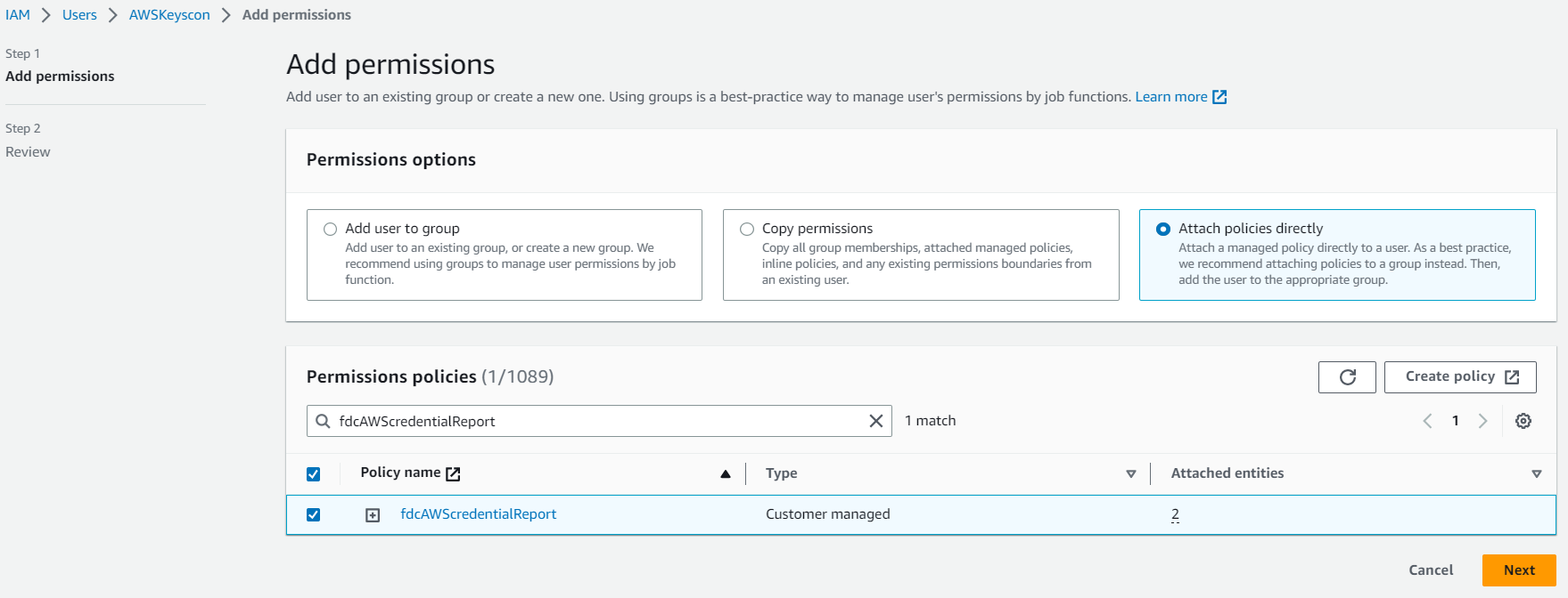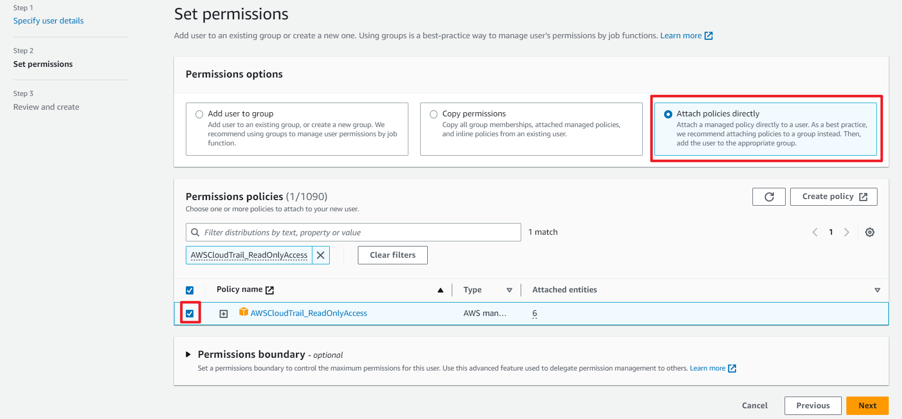 - Set the permissions to Attach existing polices directly and select AWSCloudTrail_ReadOnlyAccess.