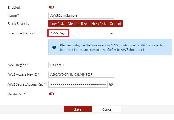 Integrate method Select AWS Keys. AWS Region Enter the region for the AWS Connector user you created in the previous task. AWS Access Key ID Enter the access key ID for the AWS Connector user you created in the previous task. AWS Secret Access Key Enter the secret access key for the AWS Connector user you created in the previous task.