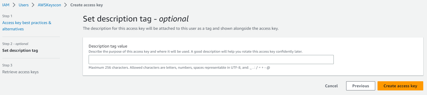 - (Optional) Set the description tag and click Create access key.