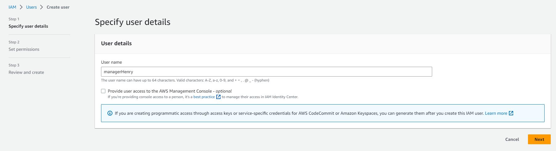 To create an IAM user: