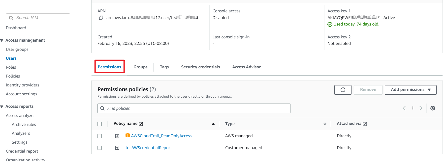 - In the Permissions tab, ensure the AWS Keys Connector has the following two permissions: AWSCloudTrail-ReadOnlyAccess and the custom policy such as fdcAWScredentialReport.