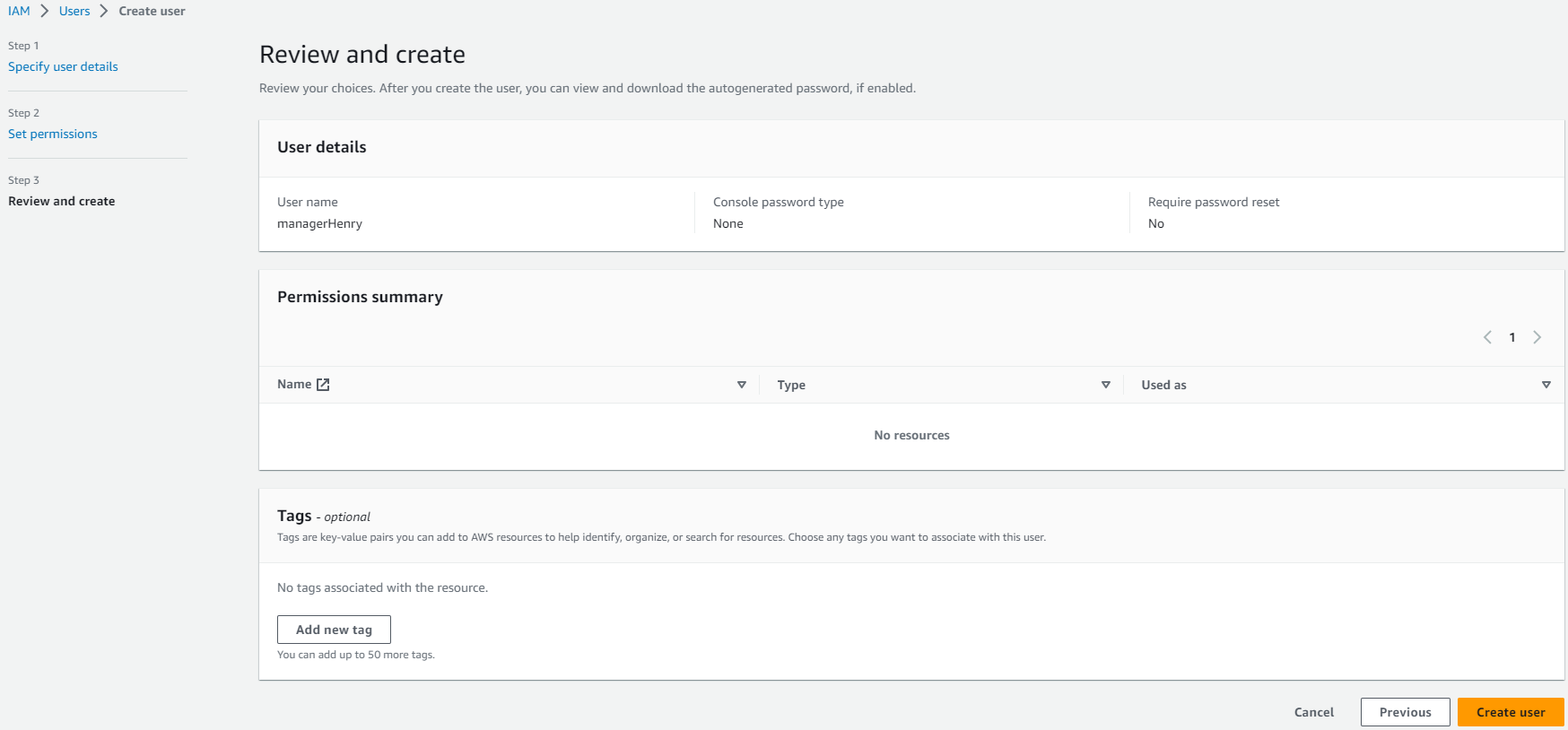 - Review the user permissions and click Create user.