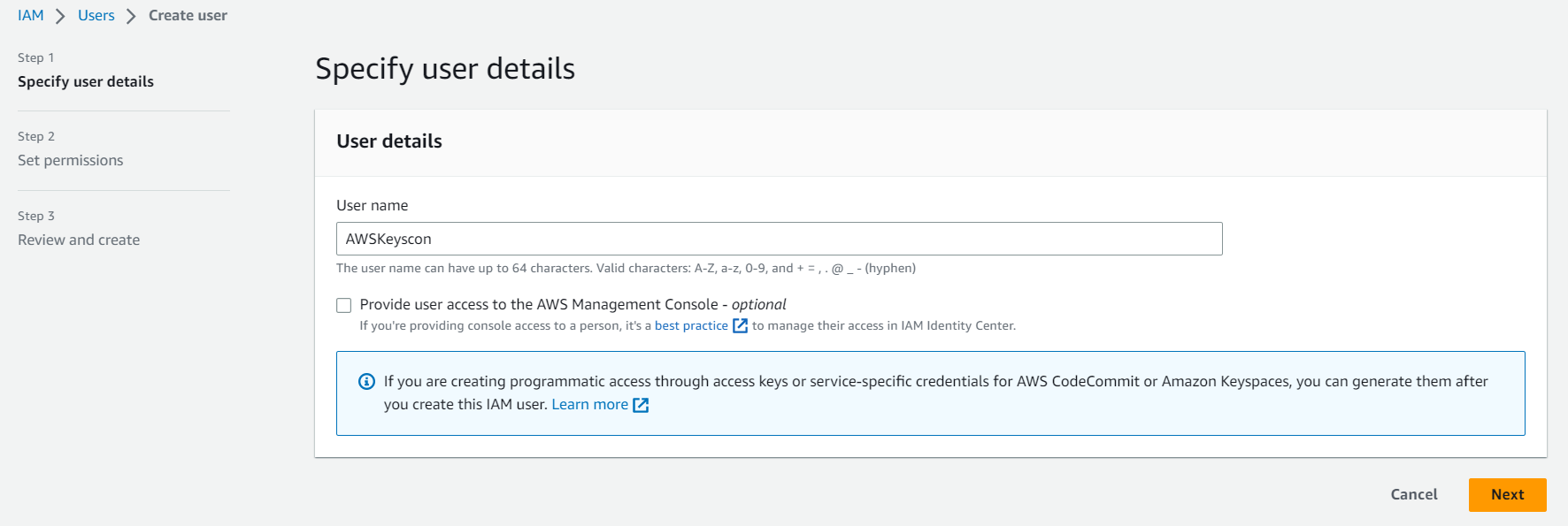 - Go to IAM users and select a user such as AWSKeyscon, and then click the Security credentials tab.