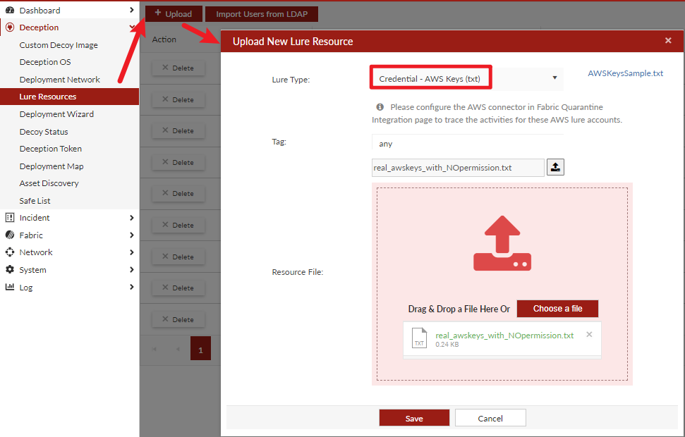 - Log in to FortiDeceptor and go to Deception > Lure Resources.