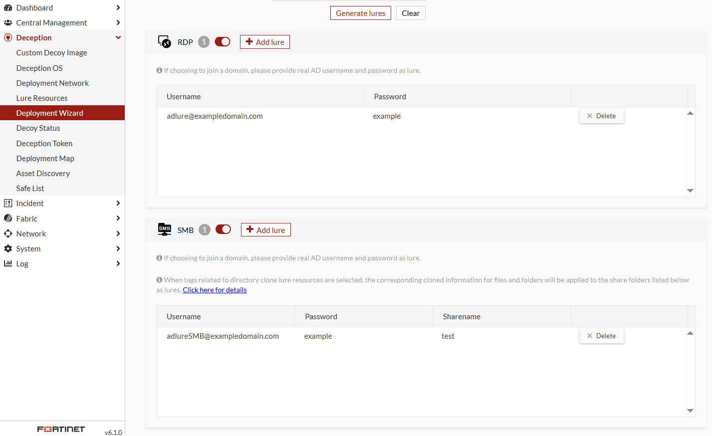 As of version 6.1, the settings for Allow domain users to access SMB/RDP and Anti-Deception Detection have been removed. These features are now automatically enabled when you enter an AD account in the format: