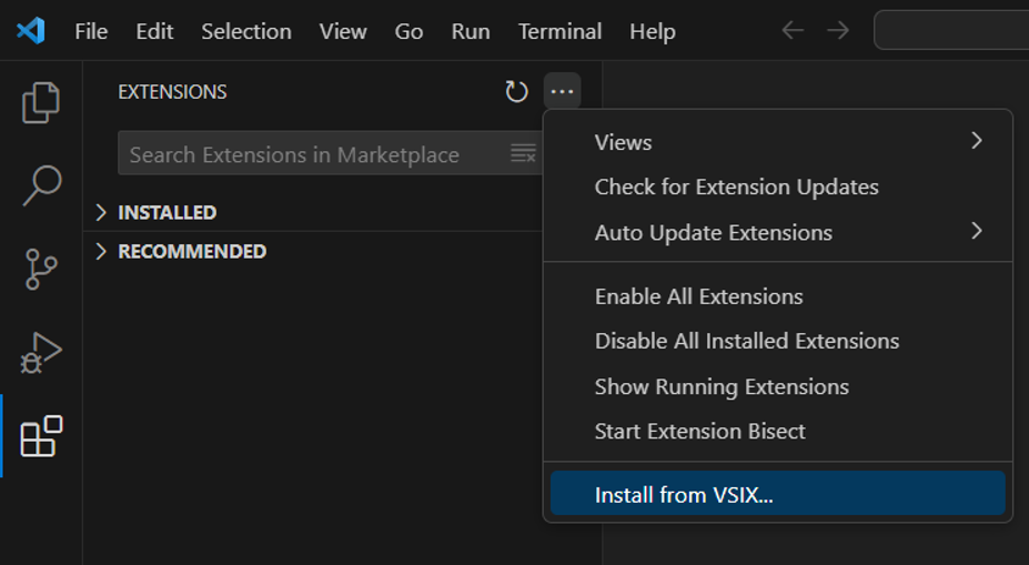 Perform the following steps to install the FortiDevSec Extension in VS Code using .vsix installation file.