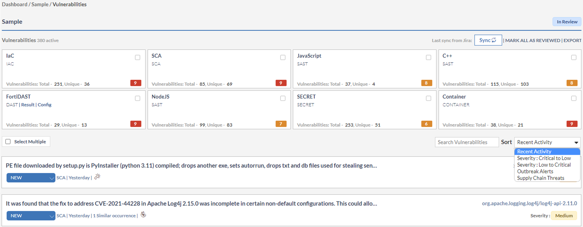 - Use sort to display the vulnerabilities based on recent activity, severity level, outbreak alerts and supply chain threats.