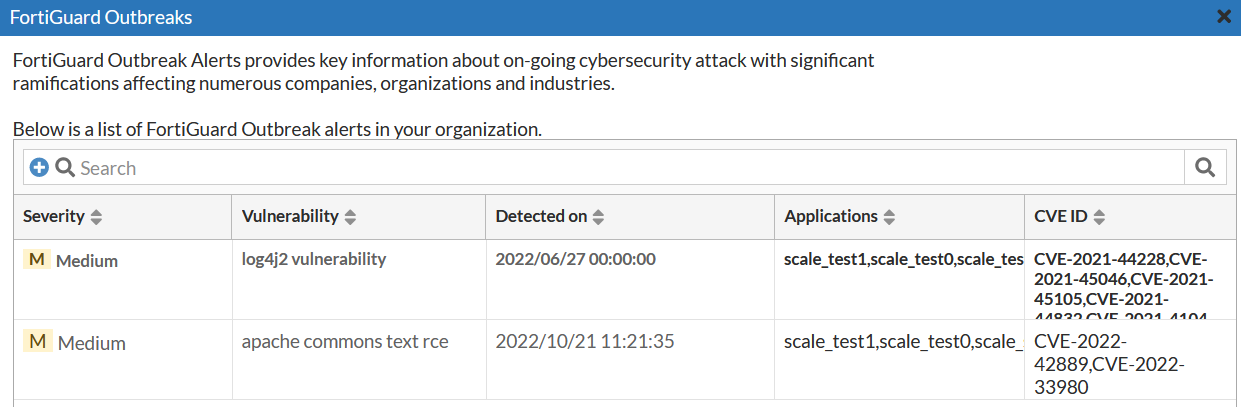 FortiGuard Outbreaks - Displays the total number of FortiGuard Outbreak Alerts detected across all your applications. FortiGuard Outbreak Alerts identified by FortiGuard Labs provide critical information about ongoing cybersecurity attacks with significant potential impact. Click arrow to view detailed information.