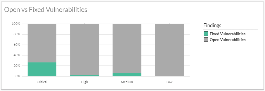 Open vs Fixed Vulnerabilities: Chart displaying the percentage of open and resolved vulnerabilities, grouped by severity.