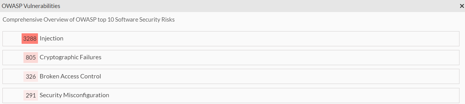 OWASP Vulnerabilities - Displays the total number of vulnerabilities detected across your organization that align with the OWASP Top 10 list. Click arrow to view detailed information.
