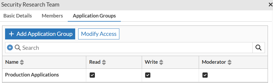 To modify access, select an existing application group, click Modify Access, change the access type, or click Remove to remove the group.