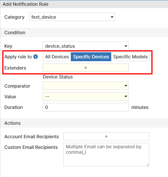 With this release, you can now define notification rules with more precision. You can set up alerts for a single device, multiple devices, an entire device group, or all active devices. This gives you more granular control over when and how notifications are triggered, ensuring that alerts are highly relevant to your specific operational needs. To add notification rules to specific devices, navigate to Extender > Notifications and click Add.