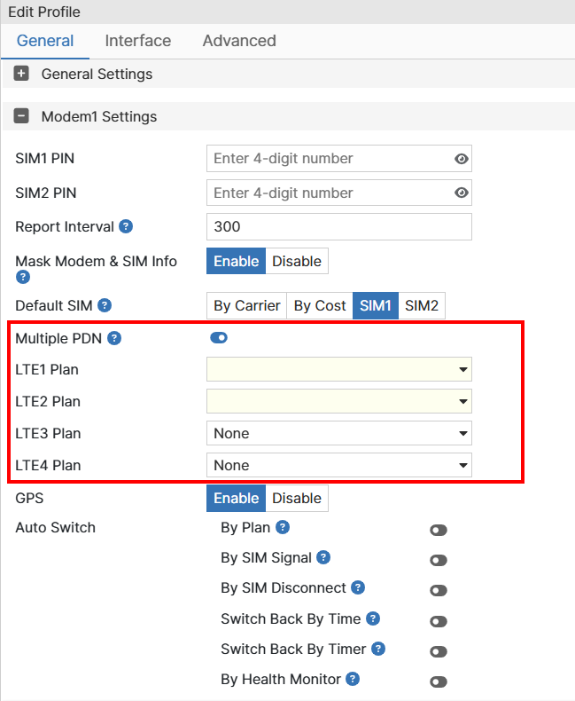 FortiEdge Cloud is now enhanced to support multiple PDN (Packet Data Network) for your devices. Note: This feature only works when a single SIM card is in the FortiExtender. Extender Profile SettingsFortiExtender 511G profiles now have a Multiple PDN option under Modem Settings, allowing you to select up to four LTE interface plans. The first two plans are mandatory, and you can add two more. You can reuse the same carrier plans across different interfaces, but only plans already configured under Carrier Plan Settings are available for selection. Once a carrier plan is used in a Multiple PDN configuration, it cannot be removed from the profile.