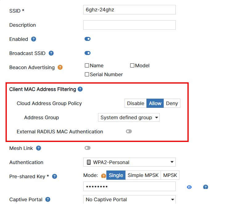 In this release, MAC filtering is enhanced by adding a deny list option. The Cloud Address Group Policy field now has three settings to provide more control over network access: