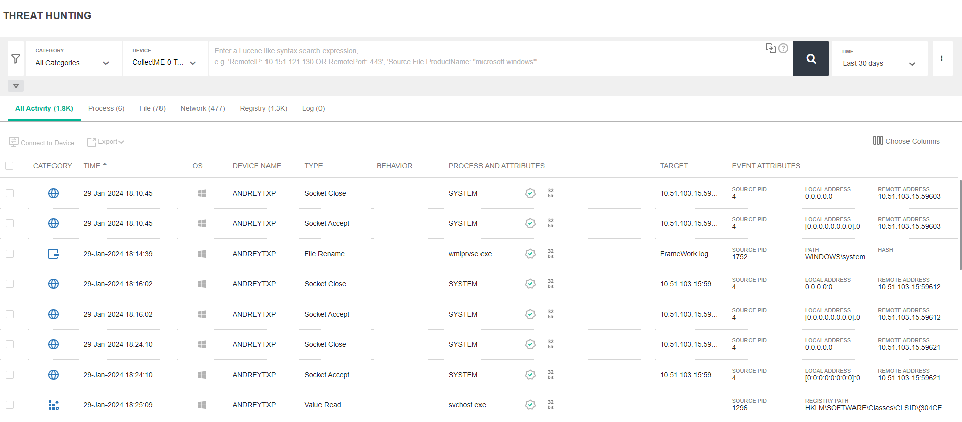 | Network Actions | The target is a network item (such as connection or URL) and all actions are Network related, such as Socket Connect, Socket Close and Socket Bind. |