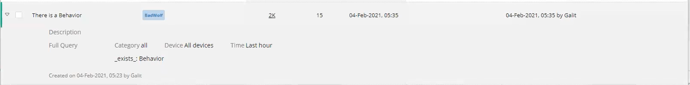 In the same manner as other security events it indicates the quantity of devices (in the DEVICE column) on which this type of activity events were found. All other aspects of a saved query security event are the same as other security events.
