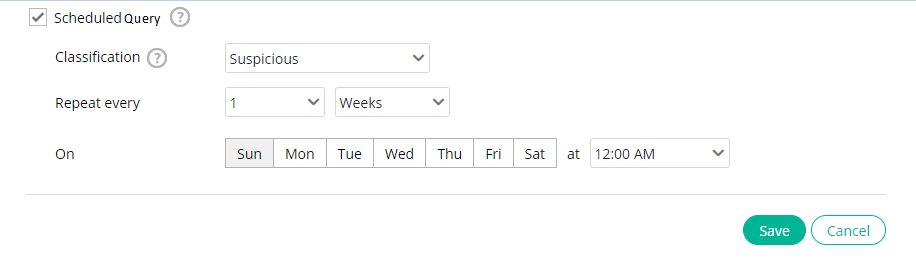 - Scheduled Query: Mark this option to automate the process of detecting threats so that this query is run automatically according to the schedule that you define. A security event is automatically created in the Incidents tab upon detecting threats (query matches). Notifications are sent according to the security event’s definition, such as via email, Syslog and so on. You can also configure playbook actions for the triggered security events from the scheduled query.