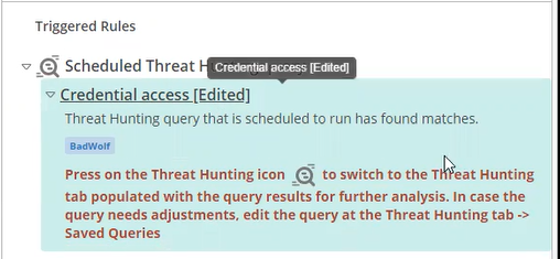 The name of the saved query is listed below it. Click that saved query’s name (for example, Credential Access (Edited)) to display additional details about this saved query, such as its description and the tags that were defined when it was created/modified, as shown below: