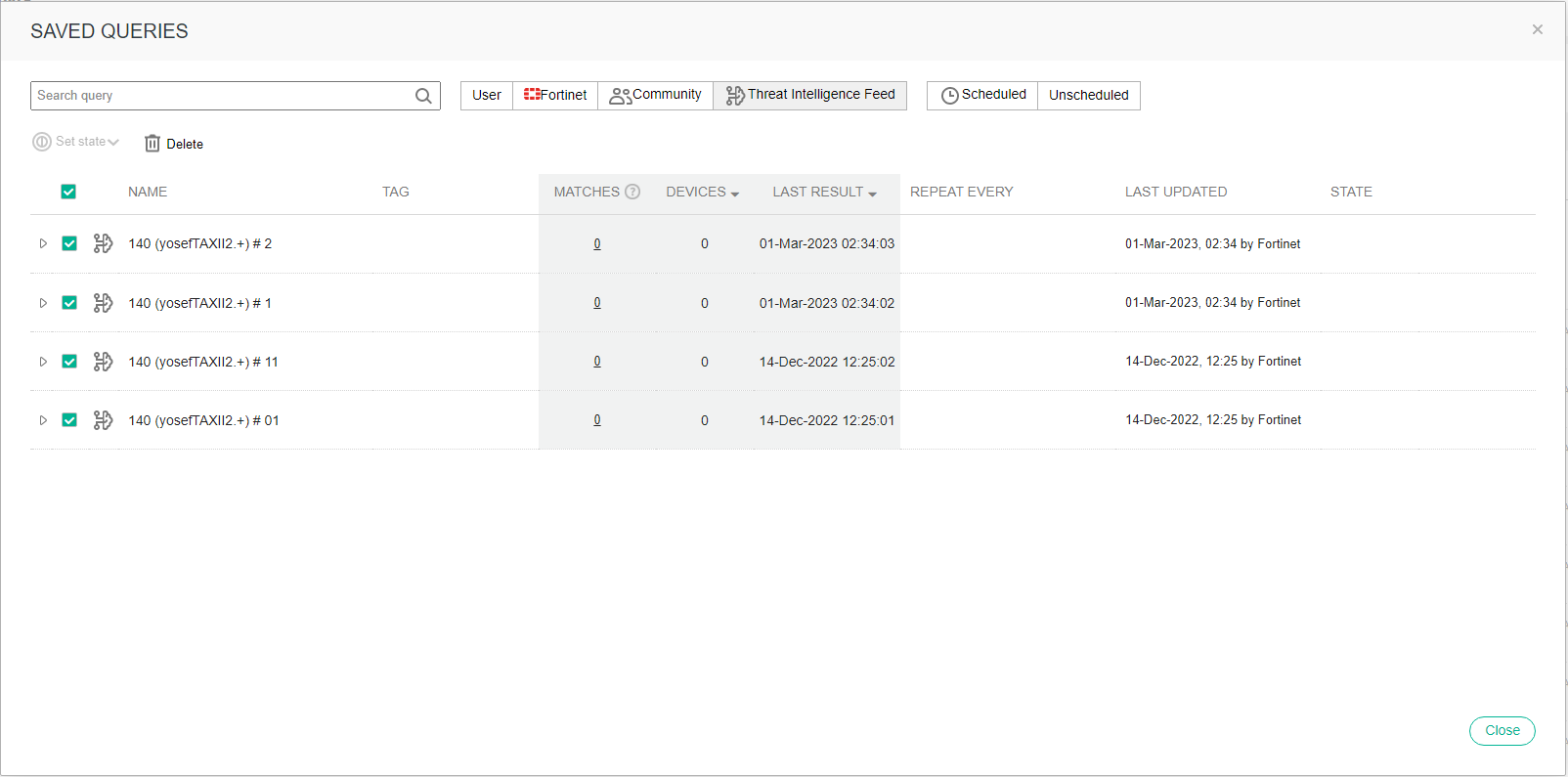 For each saved query, this list shows the quantity of matches detected (MATCHES), the quantity of devices on which these matches were detected and the last time the query was run (LAST RESULT). These three columns are highlighted in gray, as shown above. Additional details about the queries definition are also displayed in each row. Out-of-the-box queries, provided by Fortinet, are marked with the Fortinet logo