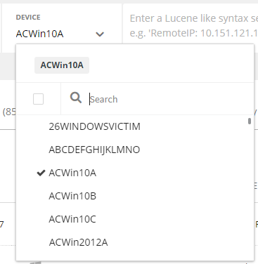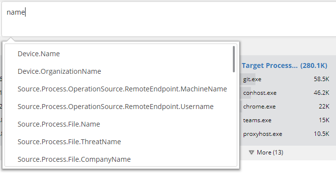 For Lucene-syntax queries, to simplify definition, the free-text query filter has an auto-complete helper dropdown list that contains all the available activity event fields, as well as available syntax operators. Simply start typing to see a dropdown menu of options. The automatic-complete helper guides you through the process of creating a query by displaying appropriate options in the dropdown menus, such as fields and operators when appropriate.