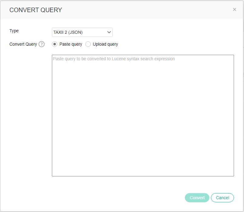 This filter enables you to specify a free-text Lucene-syntax query to filter the results. You can also convert STIX JSON and STIX XML syntax queries into Lucene syntax using the Convert Query button.
