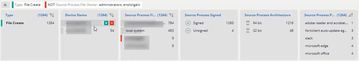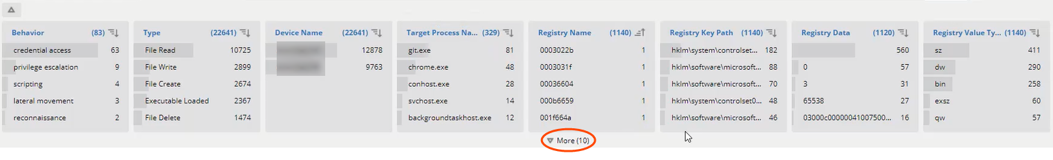 As expected, the continuous, realtime collection of Threat Hunting data produces numerous activity events. The sheer volume of activity data makes working directly with these activity events almost unmanageable. Therefore, EDR uses facets to summarize the data displayed in the results tables. Facets are predefined in EDR and represent the same data that is displayed in the results tables, but in an aggregated form. As such, facets represent the aggregation of the values in the results tables.