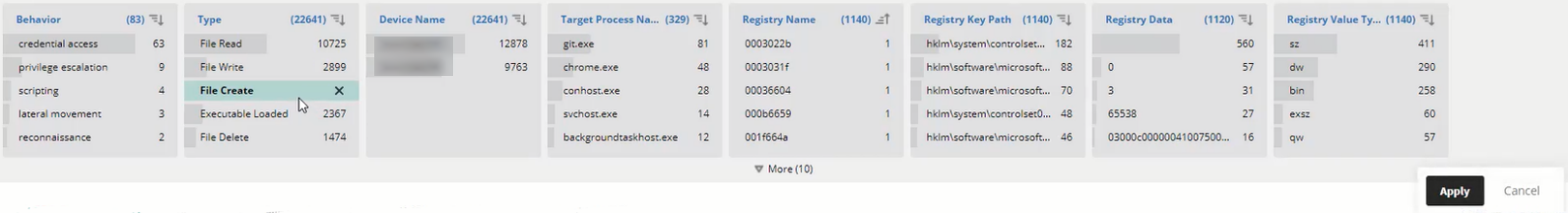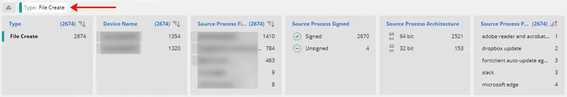 Clicking the Apply button applies the additional filtering criteria to the threat hunting query. In addition, it creates a chip (indicated by the arrow in the following picture), which represents that additional filter and displays it at the top of the Facets area. In the example below, the query has been further filtered to only show the File Create type of action. Each chip is also part of the threat hunting query.