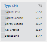 Each individual facet pane summarizes the top five items for that facet. For example, in the Type (action) facet below, the facet lists the top five actions, based on the filters applied in the query. The number at the top in parentheses () indicates the total number of different values for this facet in the results table, in this case 24. In this case, the top five actions are Socket Close, Socket Connect, Library Loaded, Key created, and Socket ind.