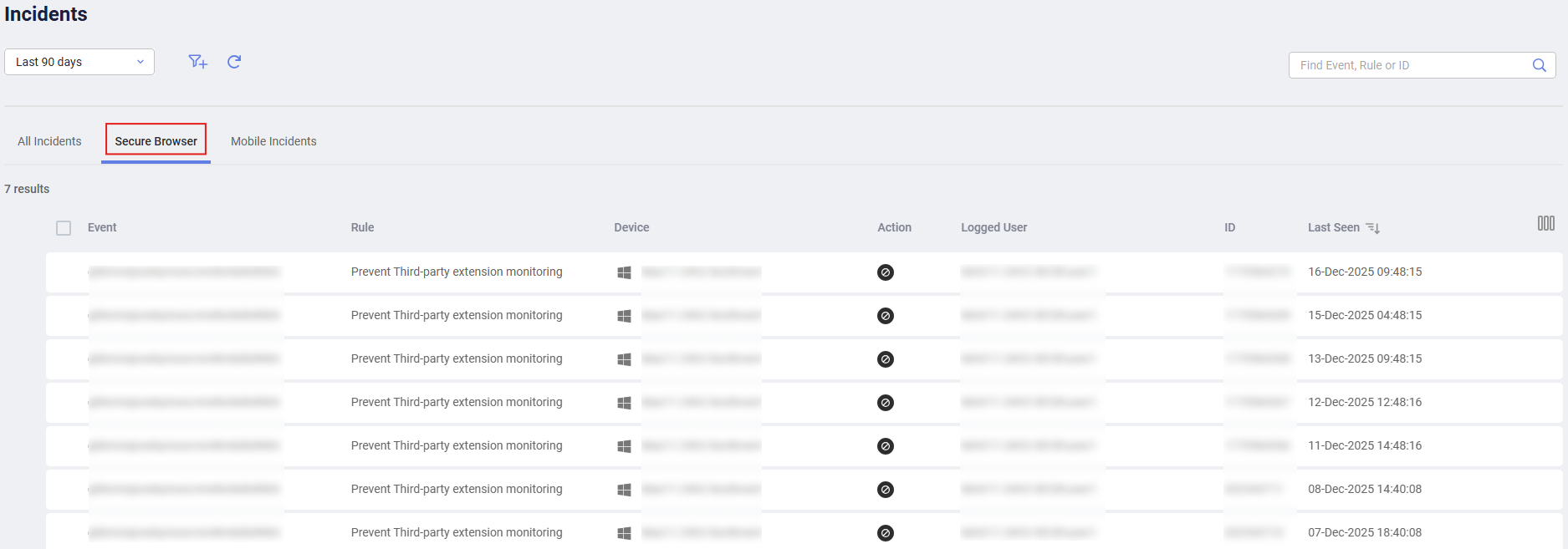 Check incidents for secure browser in the Secure Browser tab of the Incidents view.