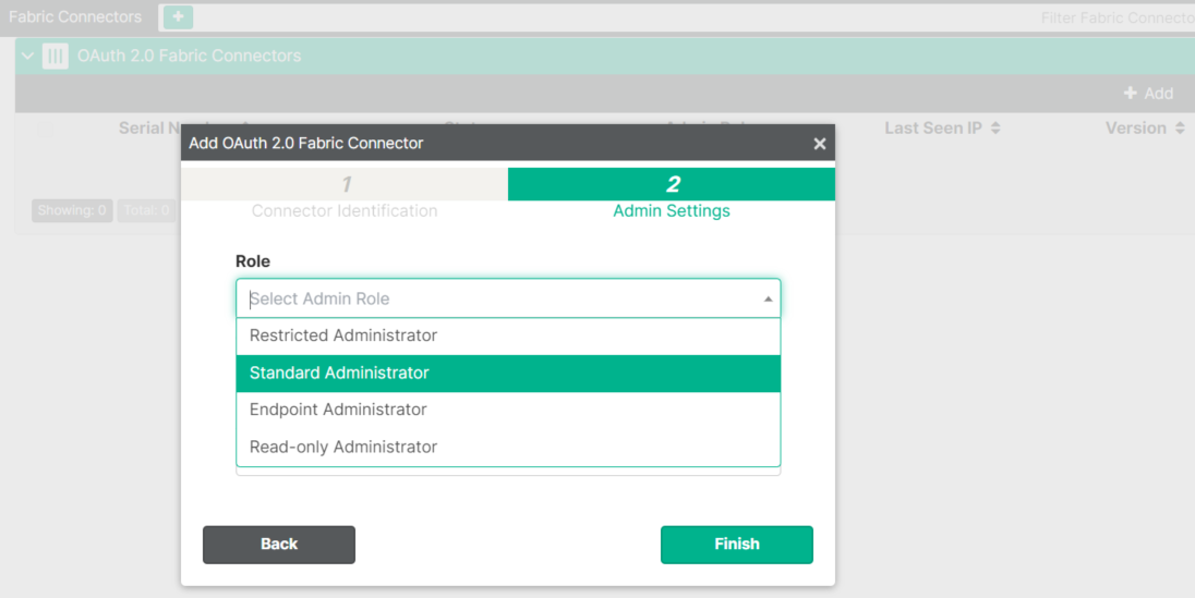Select the Role. The EMS admin role selected defines which EMS APIs (and therefore, features) that the Fabric device connector can access. For example, a Fabric connector that is configured with the Standard administrator role can access EMS APIs for endpoint and policy permissions and has read-only permissions to settings permissions. See Admin roles. Click Finish.