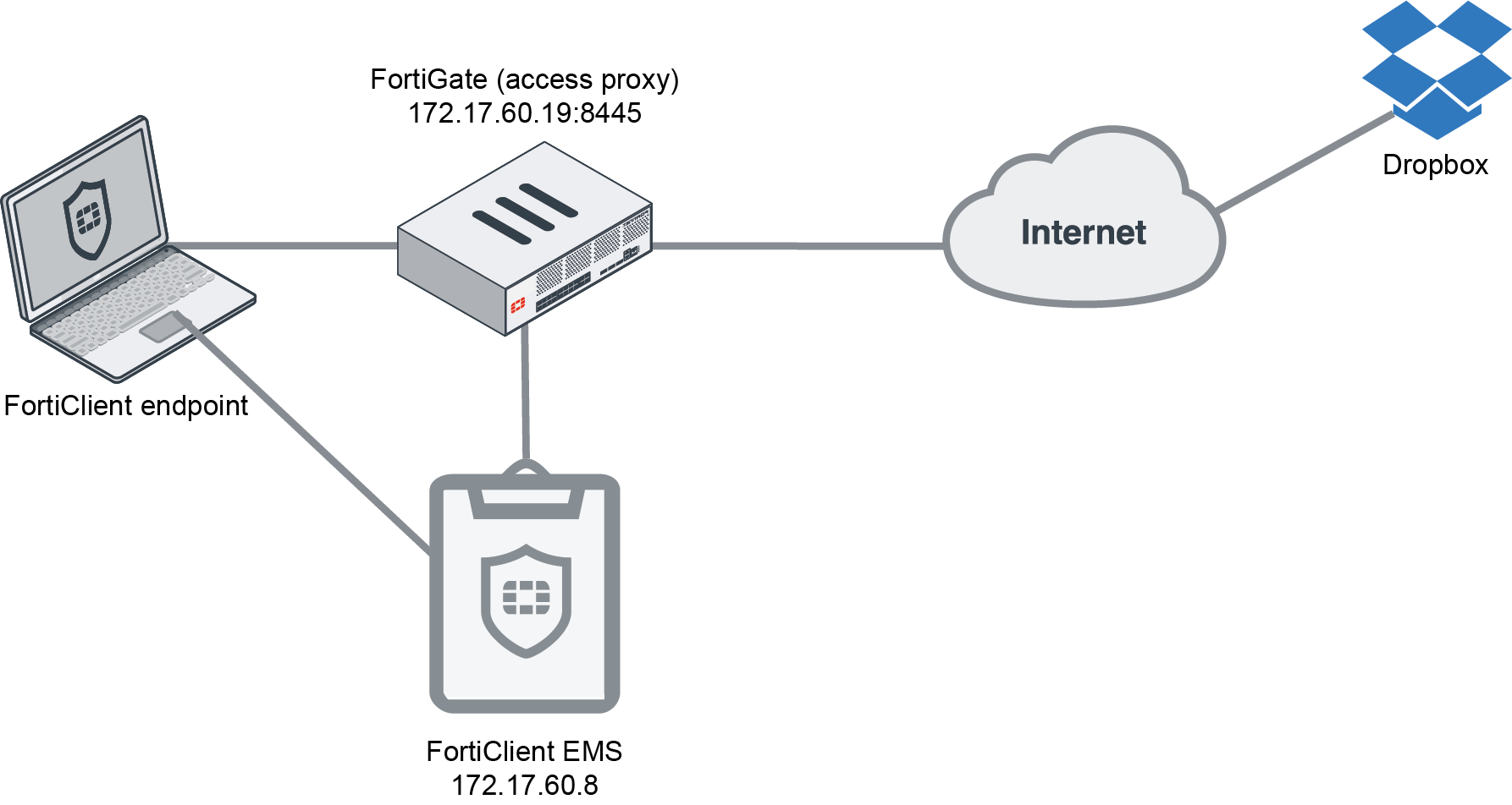 In the example topology, the EMS IP address is 172.17.60.8. The FortiGate acts as an access proxy, with virtual IP address 172.17.60.19 and port 8445. You can use one of the following methods to configure a ZTNA rule that supports wildcard FQDNs: