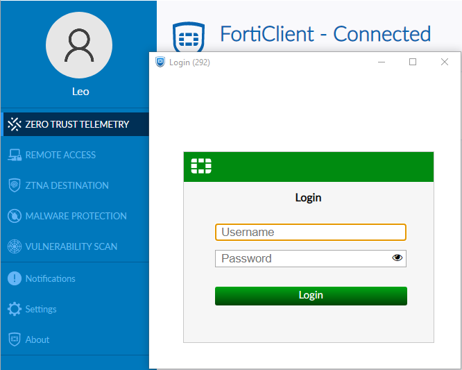 For this method, you do not need to configure a ZTNA rule as in the previous method. This method assumes that SSH and RDP TCP forwarding are configured on the FortiGate and continue to work. FortiClient pulls SSH and RDP rules from the FortiGate based on the EMS portal settings mapped to the FortiGate virtual access proxy server.