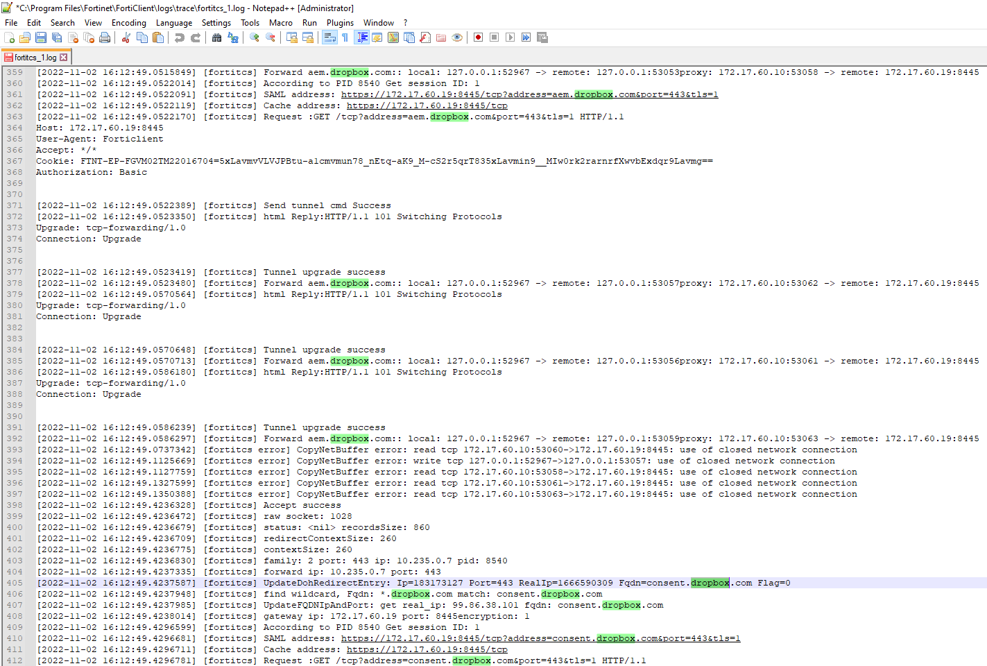 - To troubleshoot this configuration, you can view the ZTNA debug log file (fortitcs_1.log) to confirm that all traffic requests to *.dropbox.com, such as to aem.dropbox.com or consent.dropbox.com, go through the ZTNA tunnel. You can also use the log to verify that FortiClient handles the request to *.dropbox.com.