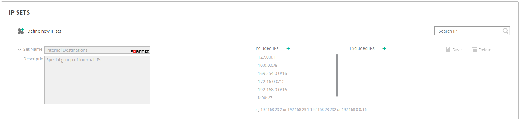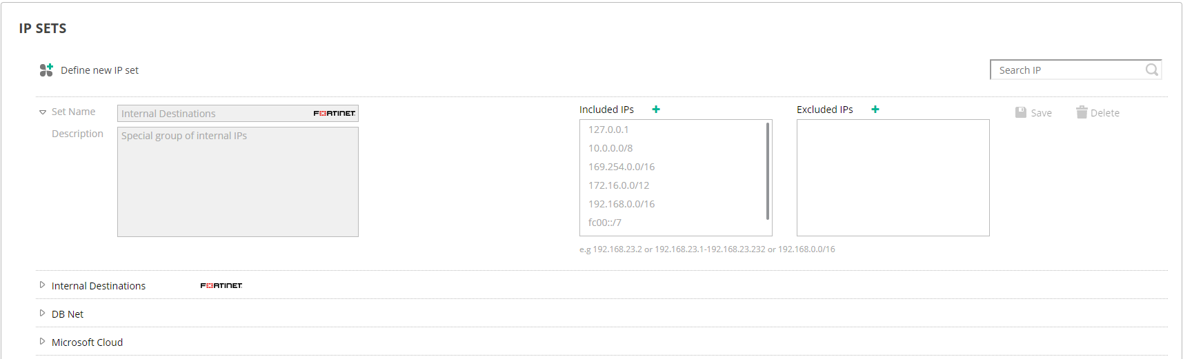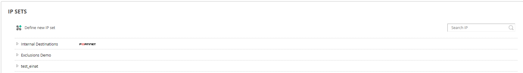The Search IP field at the top-right of the page enables you to search for a specific IP in all of the IP sets defined. The search option identifies matching IPs, even if they are part of a range in an IP set’s definition.