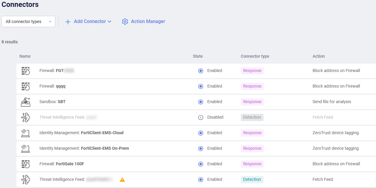 Connectors enable you to configure connectors to external systems, which enables you to trigger predefined types of actions. EDR provides various connectors out-of-the-box, such as Firewalls and NAC systems. The out-of-the-box EDR connectors utilize Fortinet products’ APIs to automatically perform the required actions in order to extend its automatic Playbook actions.