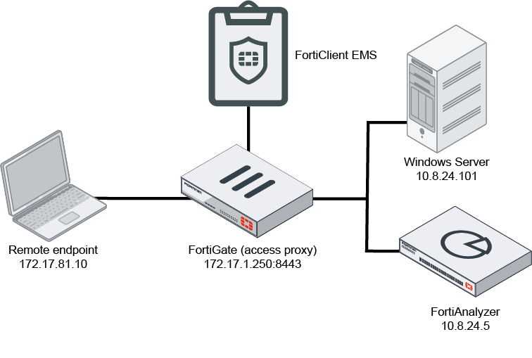 The following shows the topology for this example. This example uses two FQDNs, rdp.win.test and ssh.win.test, in place of the Windows server IP address, 10.8.24.100. This hides the internal IP address, 10.8.24.100, from end users.