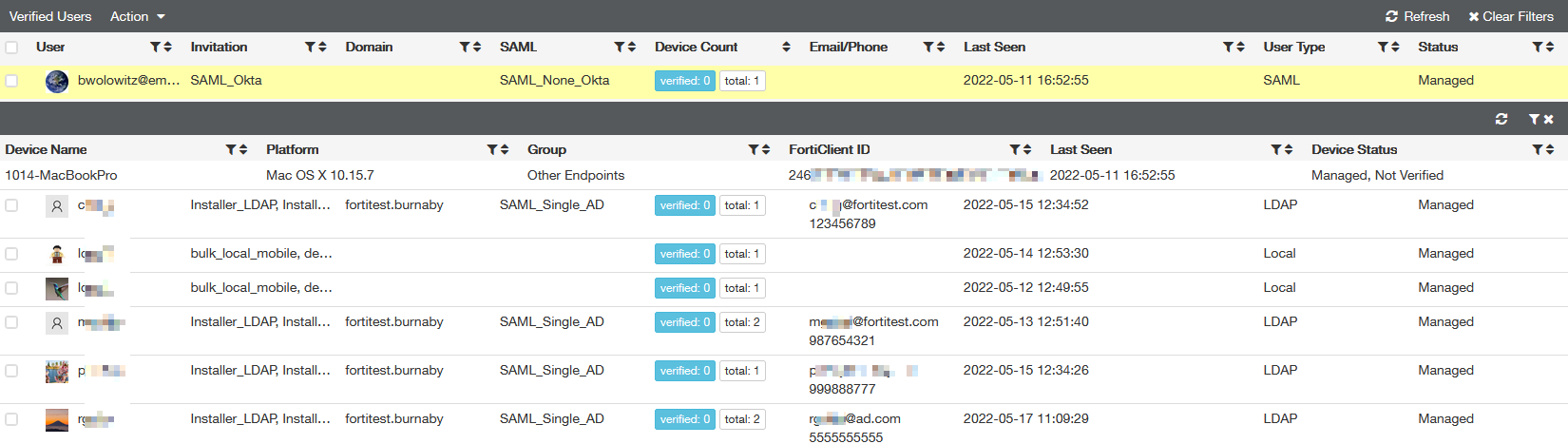 Verified Users shows a list of users who have successfully connected to FortiEndpoint by using an invitation and authenticating using a specified verification method.