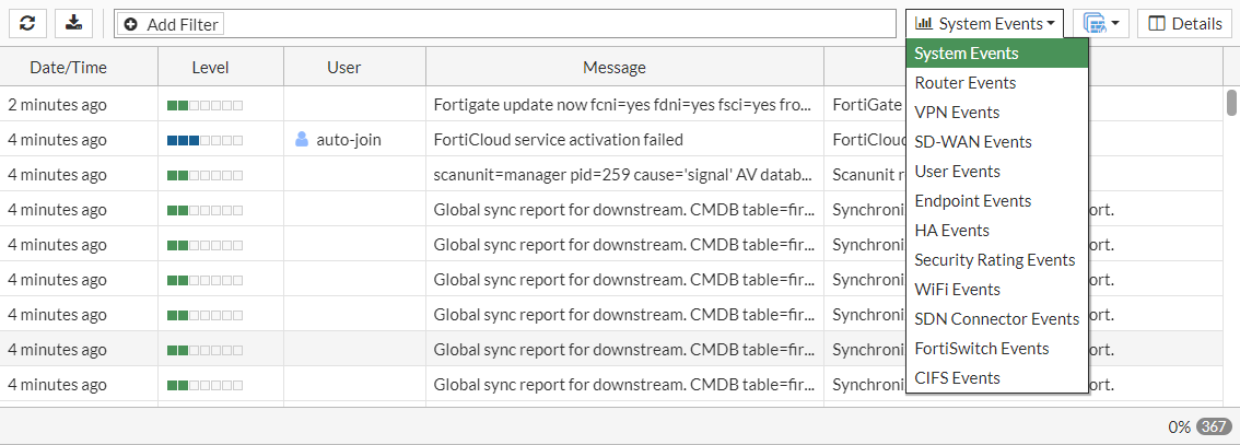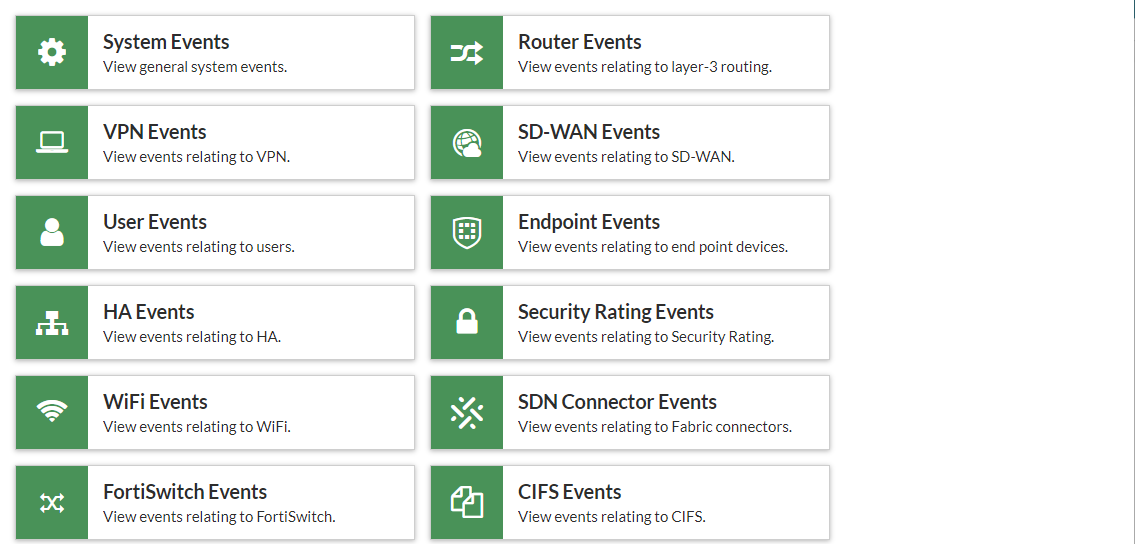 Event log subtypes are available on the Log & Report > Events page. Not all of the event log subtypes are available by default.