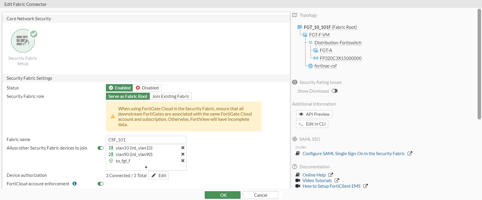 - Go to Security Fabric > Fabric Connectors and double-click the Security Fabric Setup card.